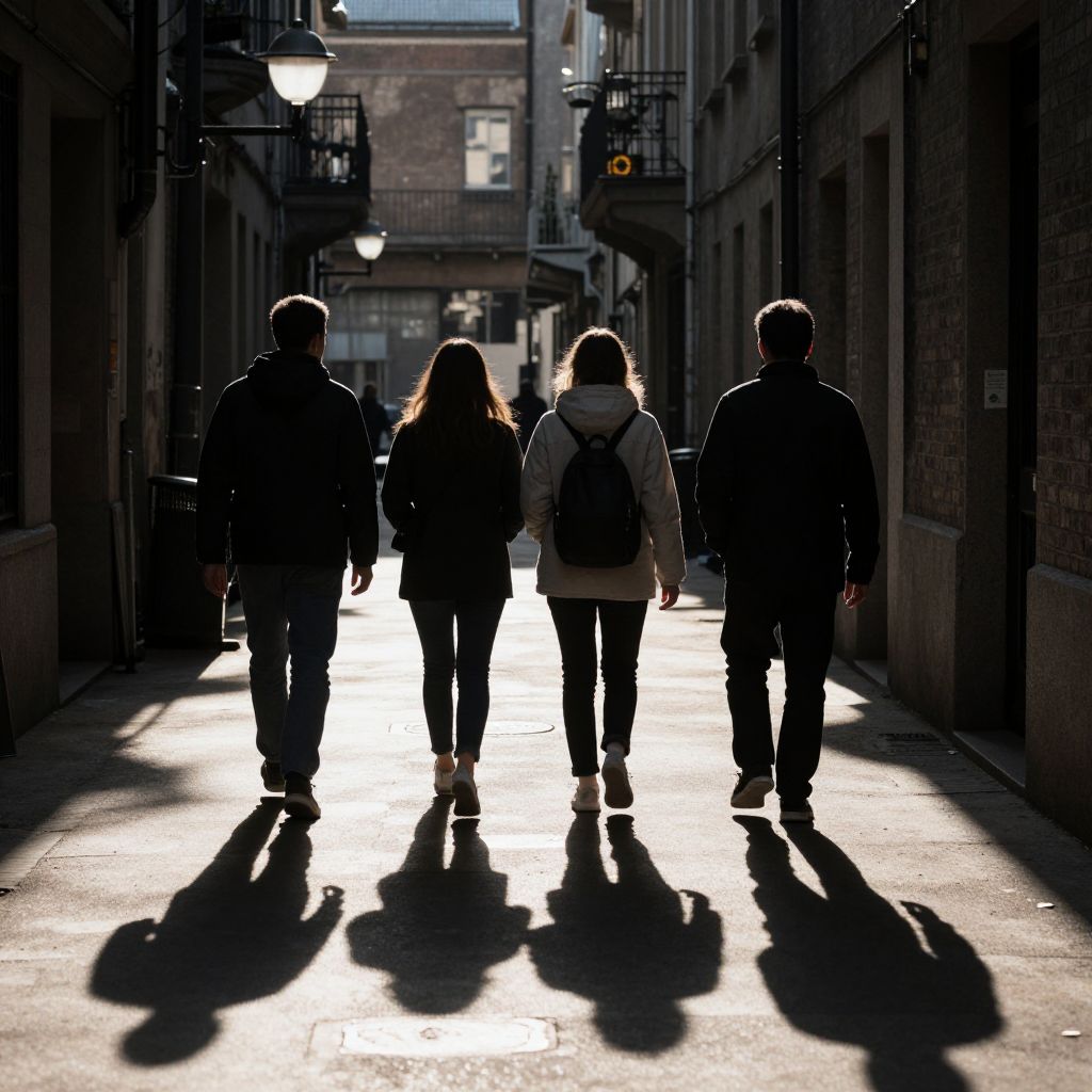 Photograph of four silhouetted people walking down a sunlit urban alley, casting long shadows, with street lamps and brick buildings in the background