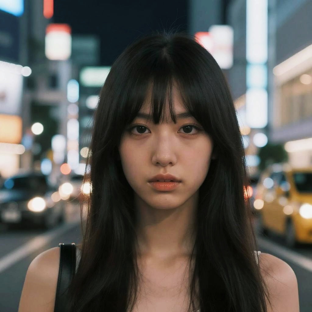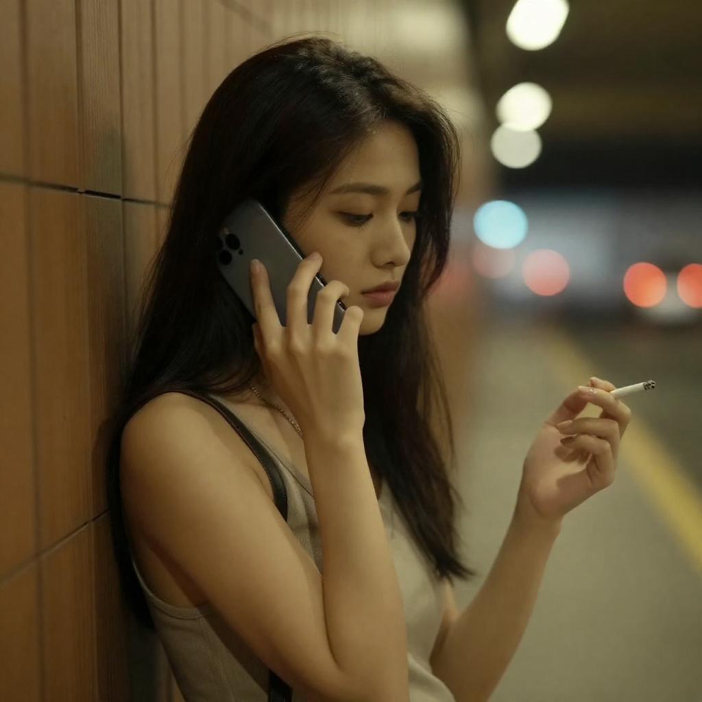 Photograph of a young woman with long dark hair, leaning against a wooden wall. She holds a phone to her ear with her right hand, looking down at her left hand, which holds a cigarette. Multicolored bokeh lights in the background. She wears a sleeveless top, revealing a necklace. Her expression is focused.
