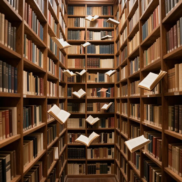 Majestic rows of wooden shelves stretch endlessly, cradling countless books whose open pages float serenely, as if suspended by unseen hands, inviting readers into a labyrinth of timeless knowledge and imagination.