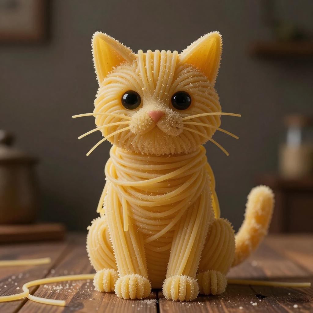 Cat made of spaghetti, perfect composition, masterpiece, best quality, [:cinematic lighting:.35]