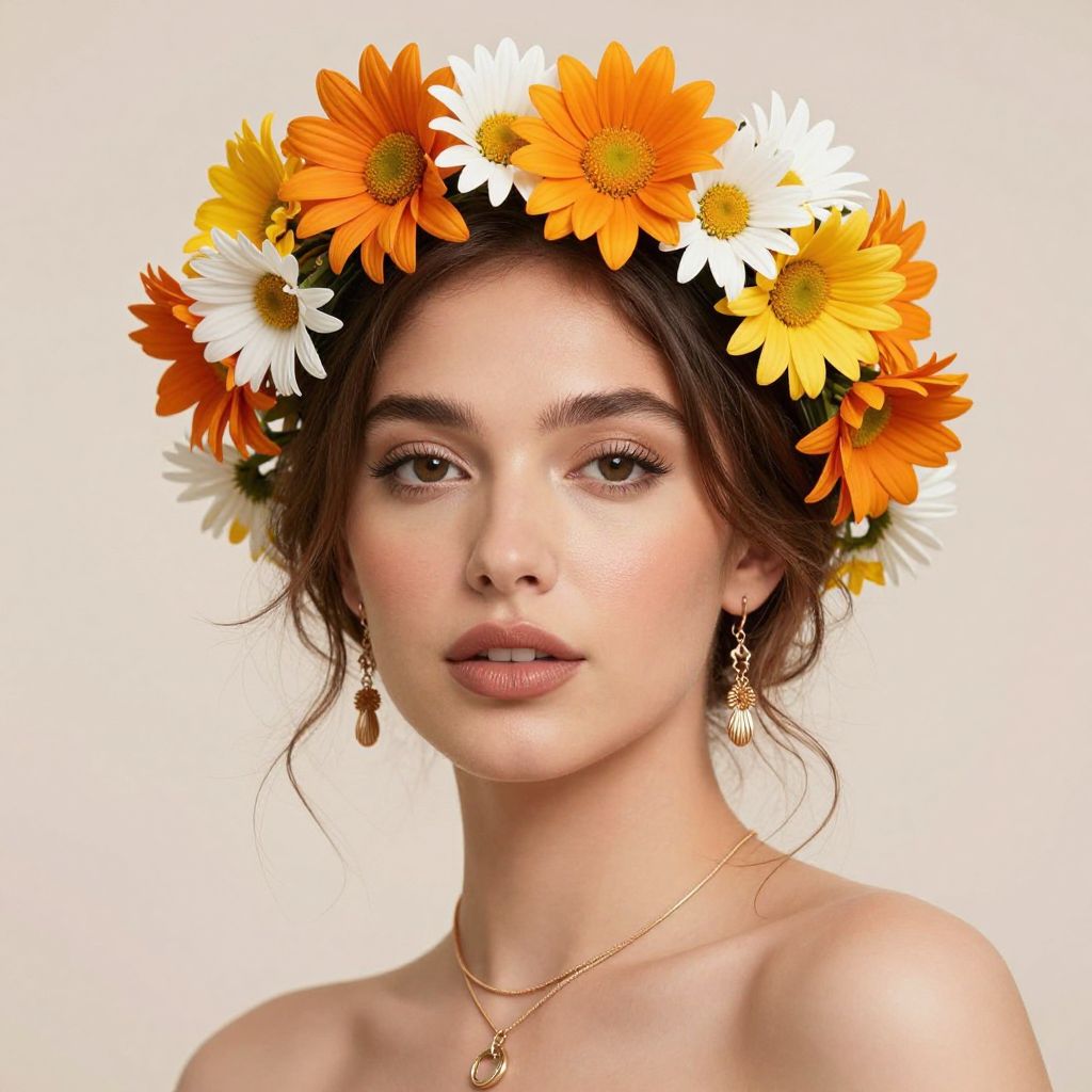 Photograph of a fair-skinned woman with brown eyes, wearing a floral crown of orange and white daisies, gold earrings, and necklace,