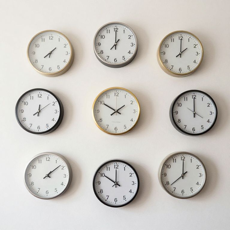 Photograph of nine round analog clocks arranged in a 3x3 grid against a white background. Each clock has a white face with black numbers and hands, with three clocks featuring a gold rim, three with a black rim, and three with no rim. All clocks show different times, with the hours ranging from 1 to 12. The clocks are evenly spaced, casting subtle shadows on the white surface, creating a minimalist and organized visual effect.