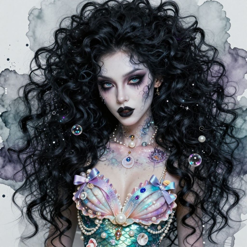 Create a close up portrait of a Whimsical caricature 35 k ultra realistic gothpunk mermaid with punkstyle hair with colorful highlights, coherent delicate detailed face, wearing a beautiful pastel shell top, iridesents, decorated with glitter, sparkles, small seashells and bubbles, ribbons, pearls, embossed high raised with pearl, and intricate patterns watercolor splash background, in the style of alberto vargas, Olivia De Berardinis, tim burton, jennifer janesko