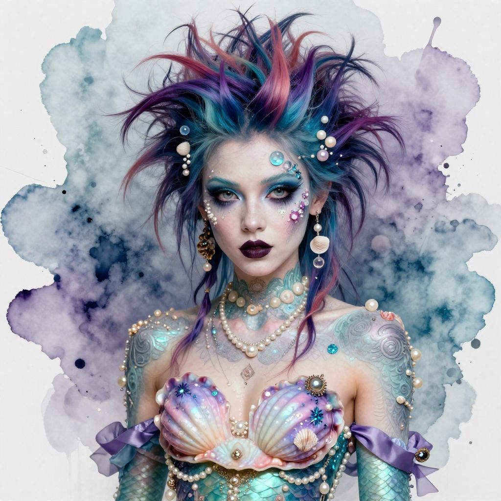 This digital art piece showcases a fantastical woman with pale, luminescent skin and vivid, multi-colored hair in blue, purple, and pink hues, styled in a wild, spiky manner. Her eyes are heavily shadowed with dark purple eyeshadow, and her lips are painted a deep, matte black. She wears a seashell bra adorned with iridescent pearls and intricate gold jewelry. Her shoulders and arms have elaborate, glowing tattoos. The background features a watercolor-like splash of dark blue and purple hues, adding a dreamy, ethereal atmosphere. Her expression is intense and enigmatic, enhancing the mystical, otherworldly vibe of the artwork.
