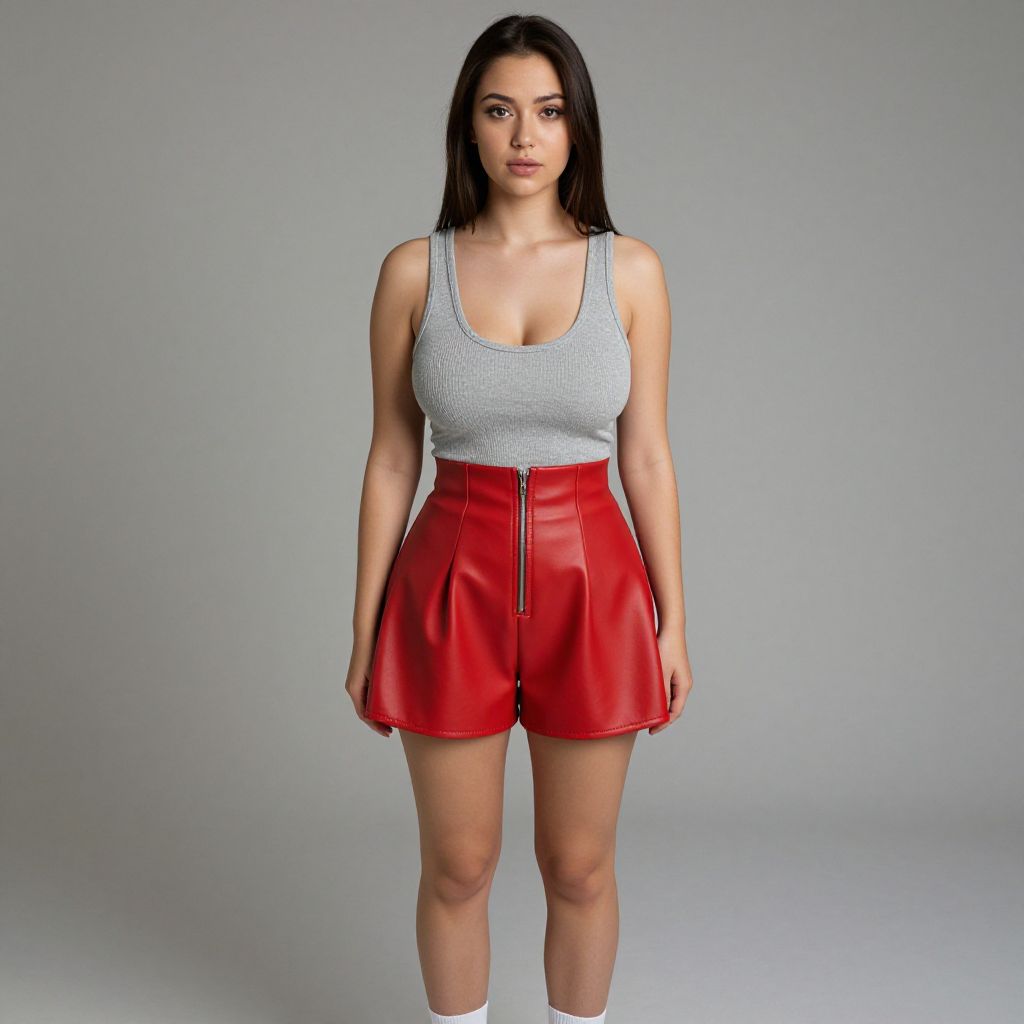 "Woman, casual streetwear, grey ribbed tank top, scoop neckline, sleeveless, red faux leather shorts, high-waisted with a flared silhouette, zipper closure, white sneakers, ankle socks, minimal makeup, simple hairstyle, studio background with a neutral color palette.. Sexy. Pretty face and beаutiful eyes. Big breasts."
