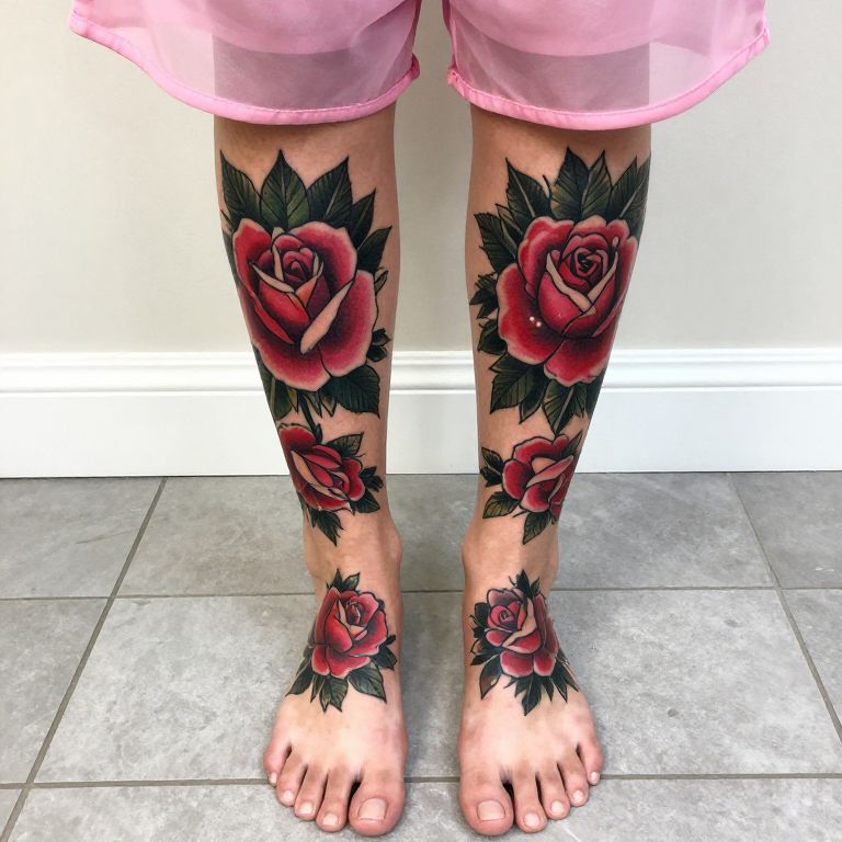 Photograph of a person's lower legs and feet, showcasing vibrant red rose tattoos with black leaves on both calves and ankles, wearing pink shorts, standing