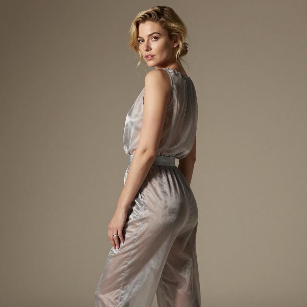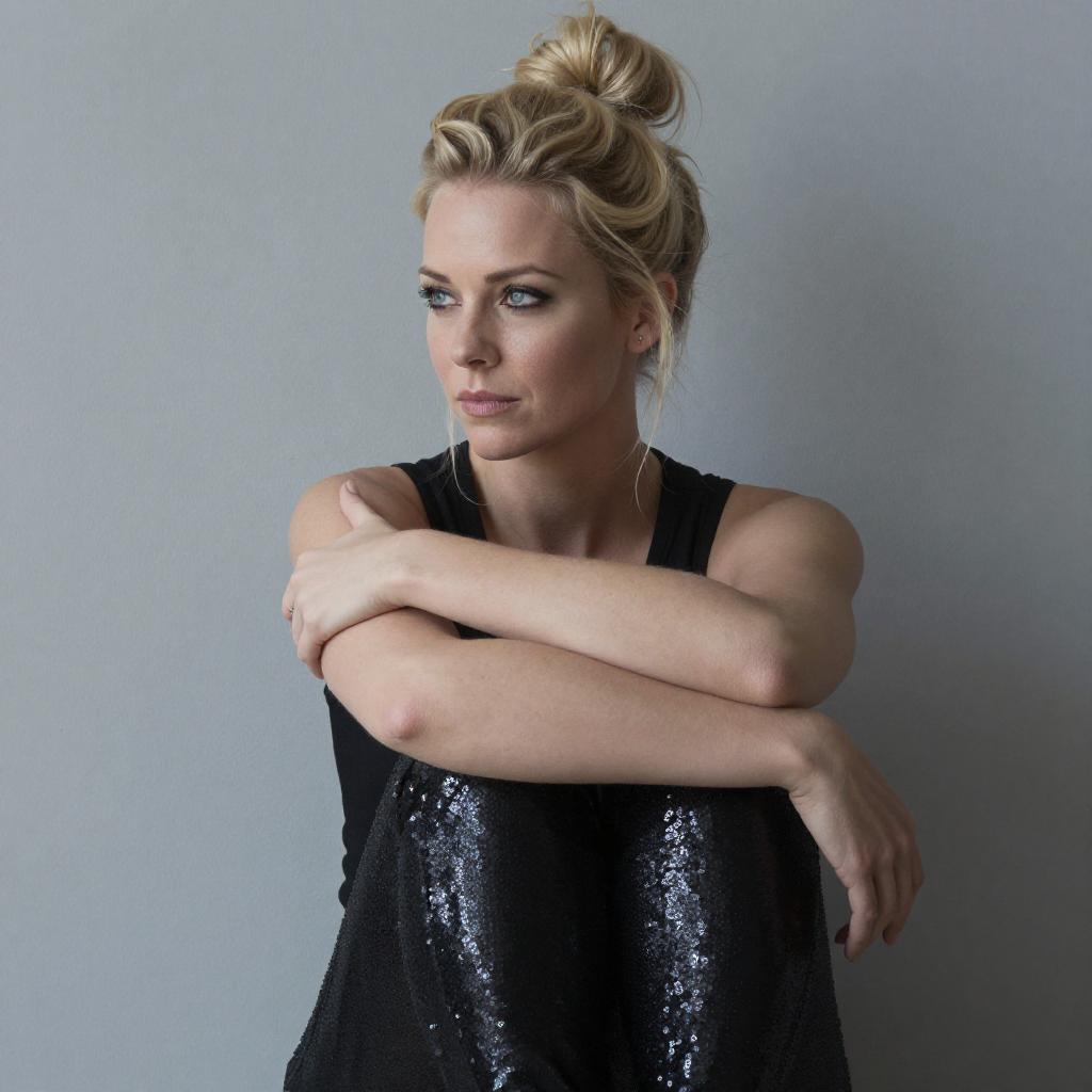 Photograph of a blonde woman with fair skin and blue eyes, wearing a white lace top and sequined black pants, crawling on all fours on a dark floor. She has her hair in a messy bun and wears white high heels with red soles. The background is a dimly lit, gray-walled room.