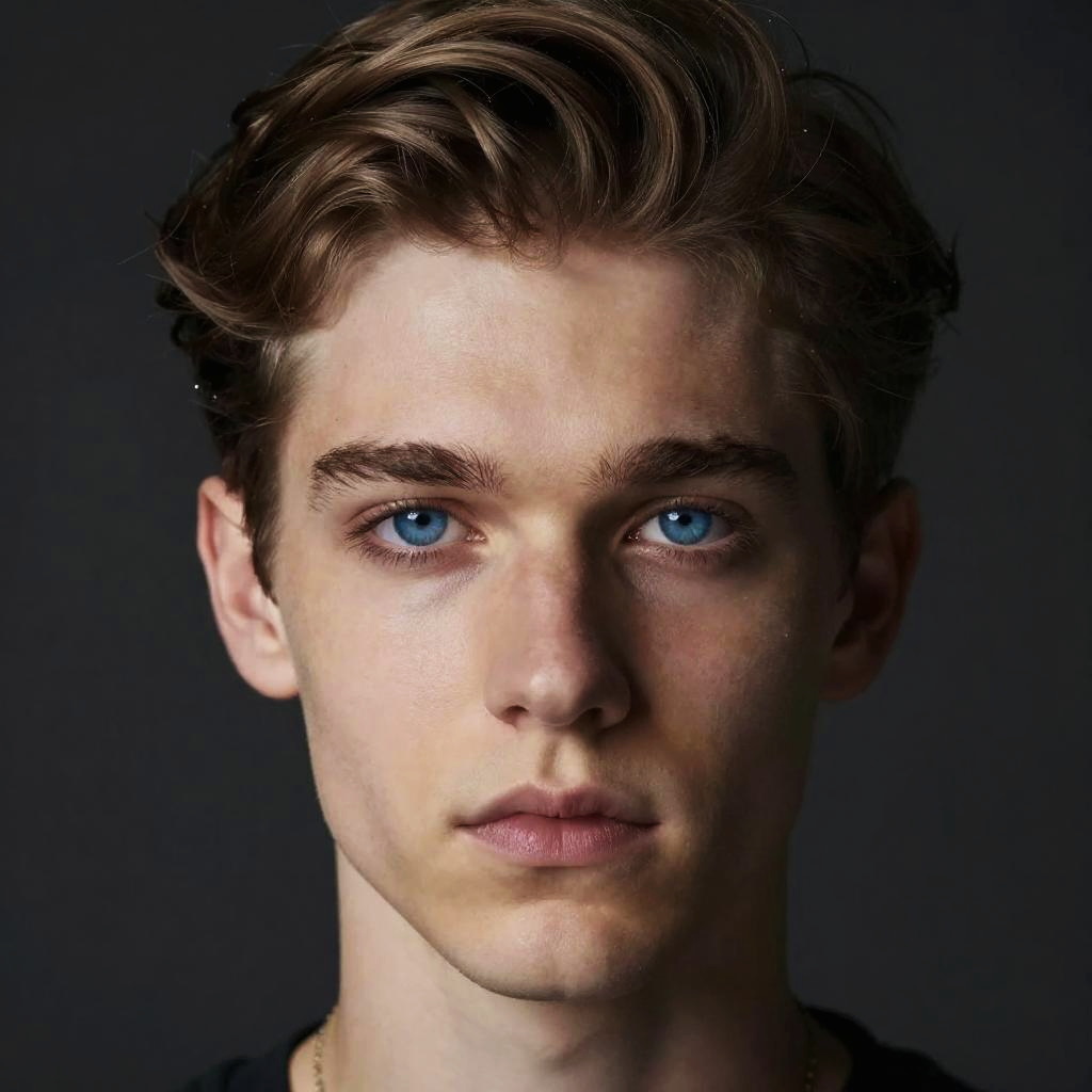 Close-up portrait of gigachad with striking blue eyes, flawless skin and perfectly styled hair, surrounded by soft glowing particles, minimalistic dark background to emphasize facial features, ultra crisp high resolution detail