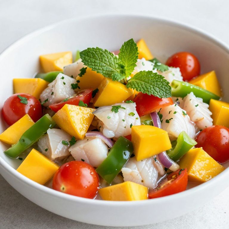 Vibrant ceviche featuring diced mangoes, cherry tomatoes, green bell peppers, and chunks of white fish, garnished with fresh cilantro and a sprig of mint, presented in a white bowl atop a textured surface.