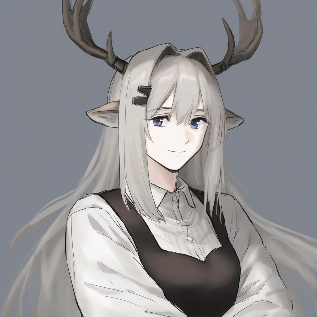 Digital illustration of an anime-style female character with deer ears and antlers. She has long grey hair, blue eyes, and wears a white buttoned shirt under a black pinafore dress. The character has a relaxed expression and features hair clips near her bangs.
