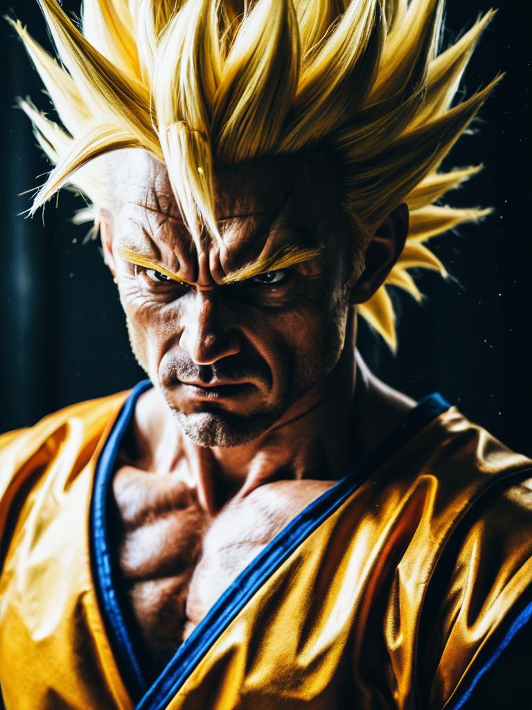 Man in Super Saiyan Costume, cinematic realism, heroic cosplay portrait