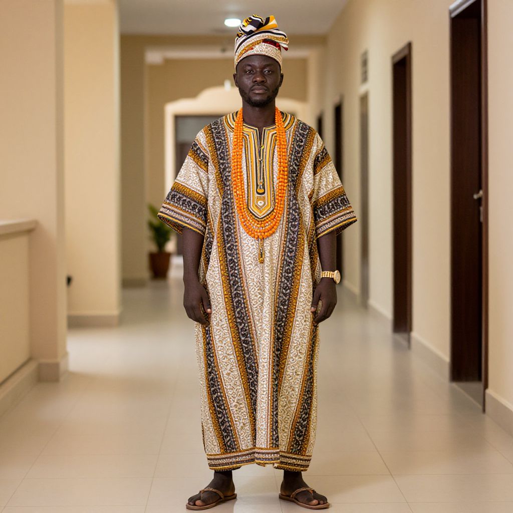 Photograph of a tall, dark-skinned African man standing in a brightly lit, beige corridor. He wears an elaborate, traditional, patterned robe in shades of white, black, and orange, adorned with intricate beadwork and a large, circular orange and black necklace. His head is covered with a matching headdress. He has a gold wristwatch and stands with a neutral expression. The corridor has white tiled floors and beige walls with dark brown doors on the right. The background is slightly blurred, featuring more doors and a potted plant. The overall style is traditional African attire.