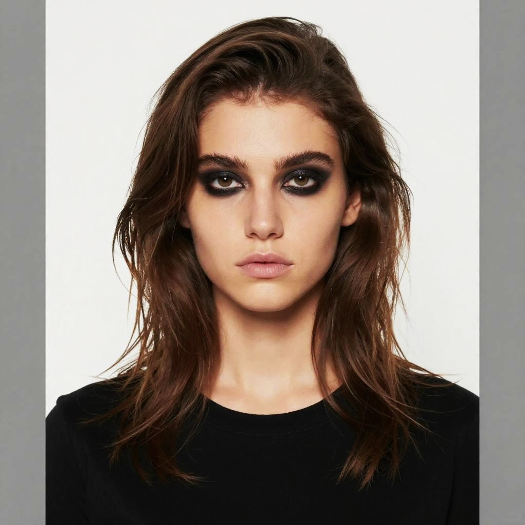 Photograph of a young woman with medium-length, wavy brown hair and dark, smoky eye makeup. She has a neutral expression and is wearing a black top. The background is a plain white, making her the focal point. The image has a gray border on both sides, and her skin tone is a light olive. The overall style is modern and slightly edgy.