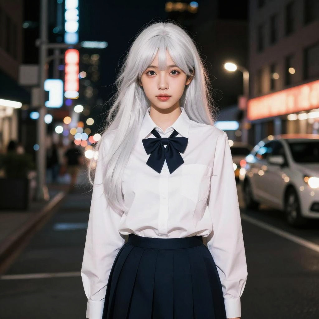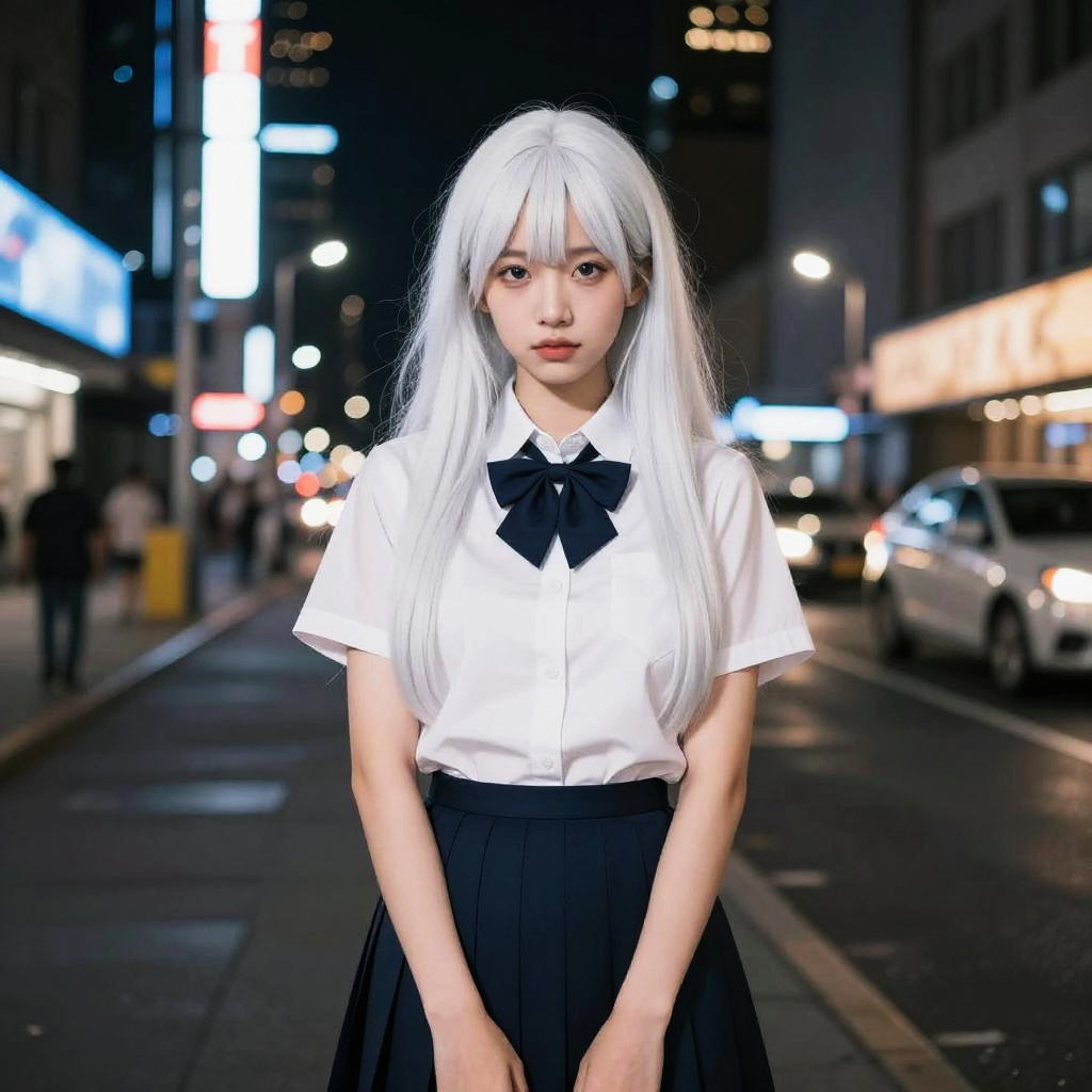 (8k, RAW photo, best quality, masterpiece:1.3), (realistic, photo-realistic:1.37), (night), (looking at viewer:1.331), (white hair), posing, new york, street, nightcityscape, cyberpunk city, soft light, 1girl, extremely beautiful face, bust, put down hands, Random hairstyle, Random expression, big eyes, lower abdomen, (JK_suit), (JK_shirt), JK_style, (dark blue JK_skirt), (bow JK_tie), mix4