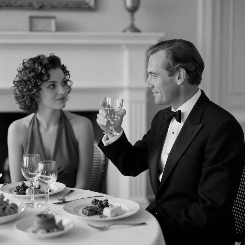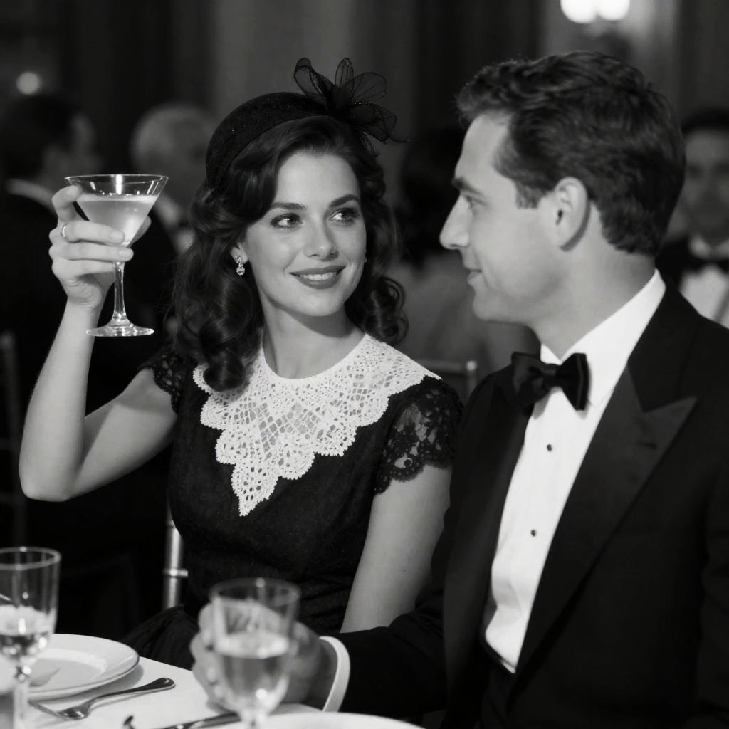 Black-and-white photograph of a man and woman in formal attire at a elegant dinner. Woman with wavy hair, lace collar, and hat raises a martini glass, smiling at the man. Man in tuxedo with bow tie, looking at her. Background has blurred guests and dim lighting. Both holding glasses in foreground.