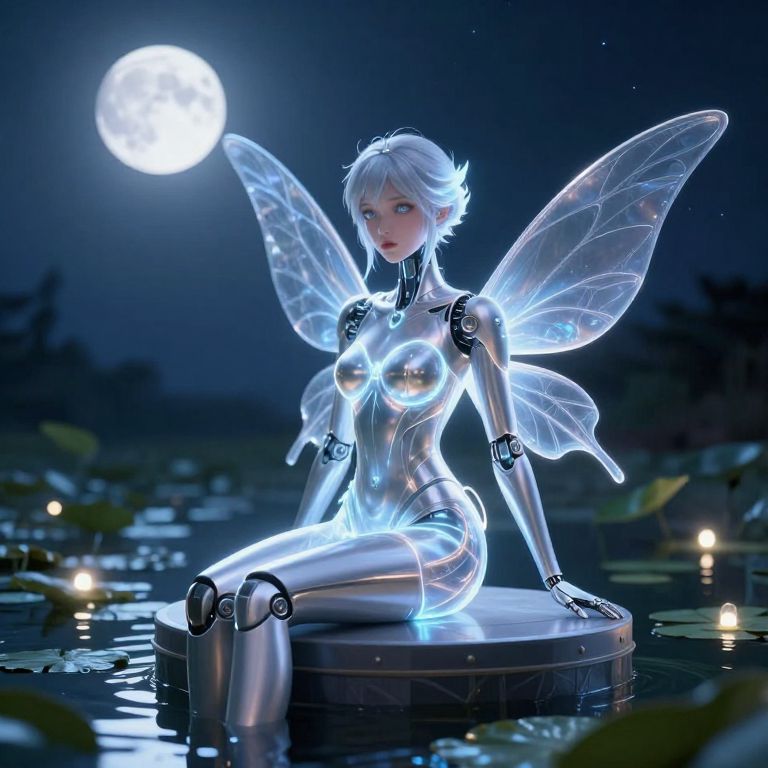 A futuristic, CGI-rendered image of a glowing, silver-toned female robot fairy with transparent wings and a sleek, form-fitting dress. She's seated on a cylindrical pedestal by a moonlit pond, surrounded by lily pads and floating lights. The full moon in the dark blue night sky casts a bright, ethereal glow over her illuminated features. Her expression is serene and slightly mysterious.