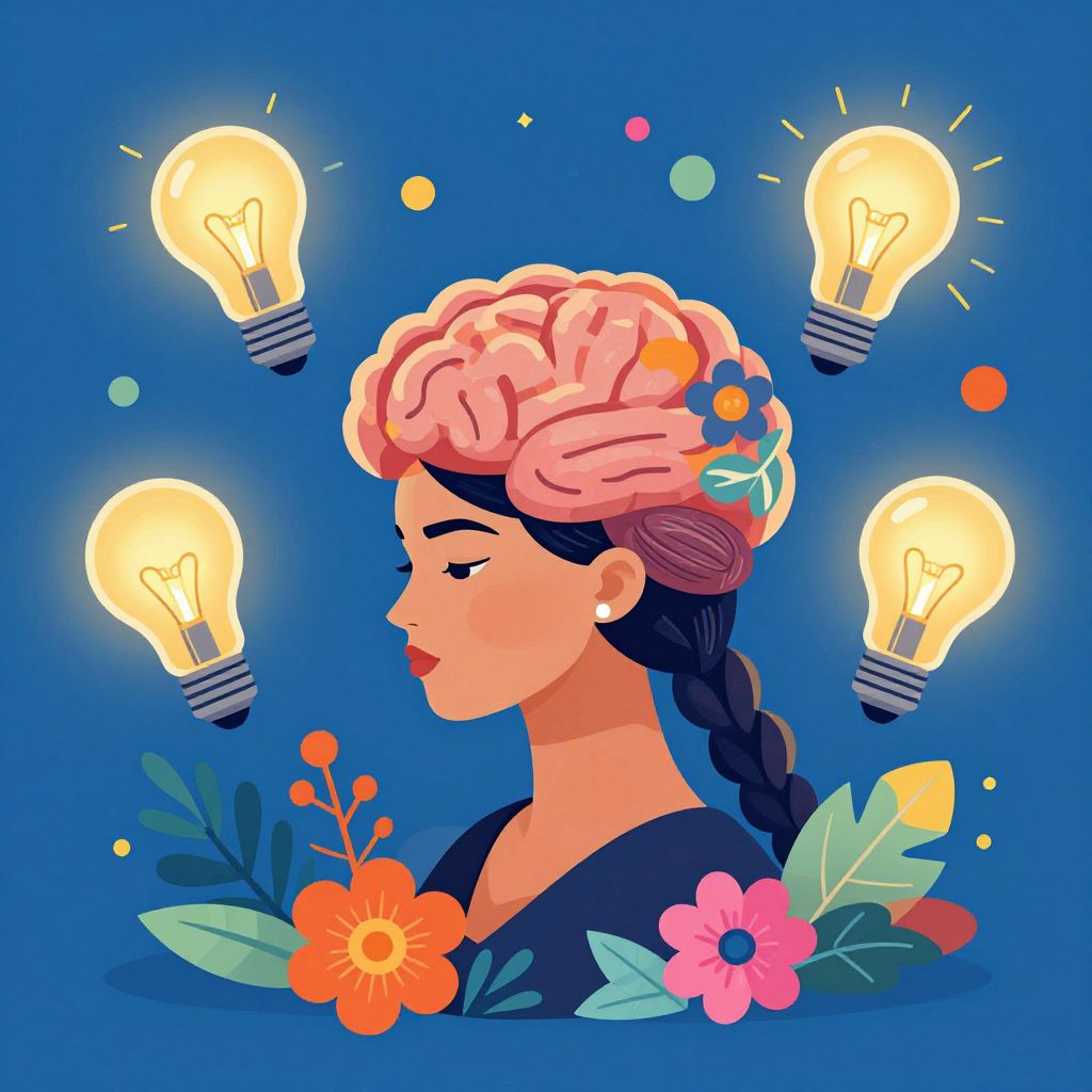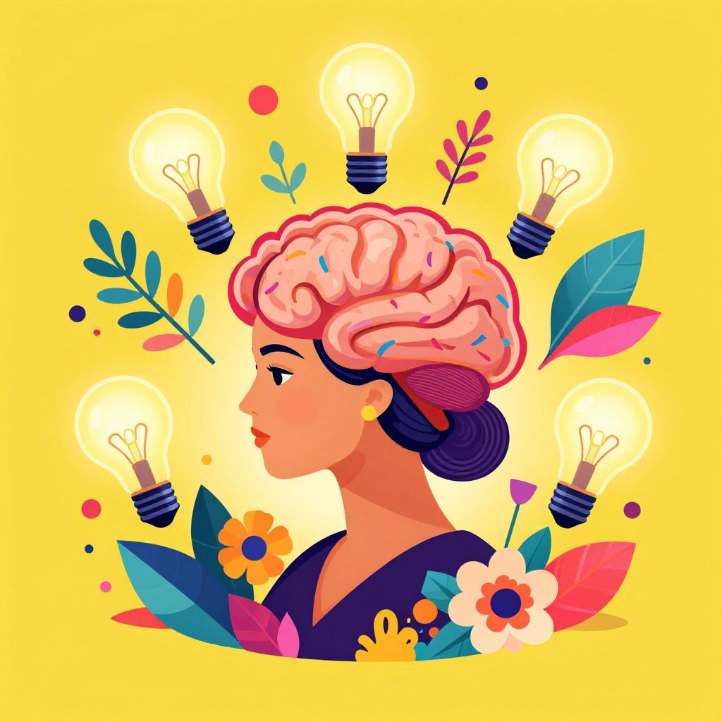 Digital illustration of a woman with a pink brain, surrounded by light bulbs, colorful leaves, and flowers on a yellow background.