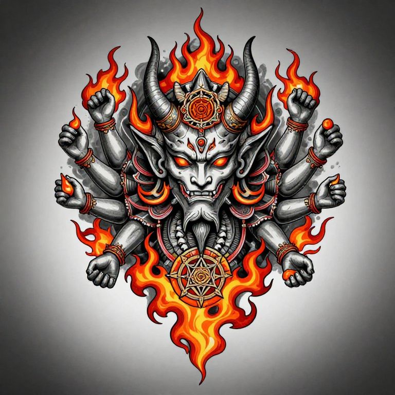 Intricate asura's wrath tattoo concept incorporating a demonic face with multiple arms, swirling fire motifs, and sacred geometric shapes, executed with sharp fine lines and vivid fiery color palette on a grayscale gradient.
