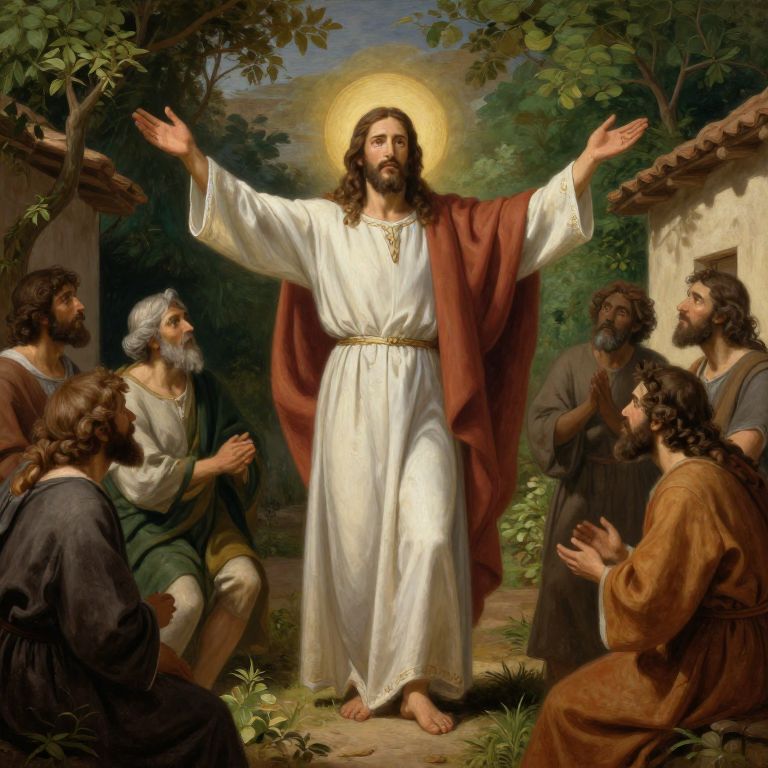 Jesús cristo in traditional biblical attire, arms outstretched in blessing, surrounded by disciples in an ancient village setting, lush greenery, soft warm lighting, realistic painting