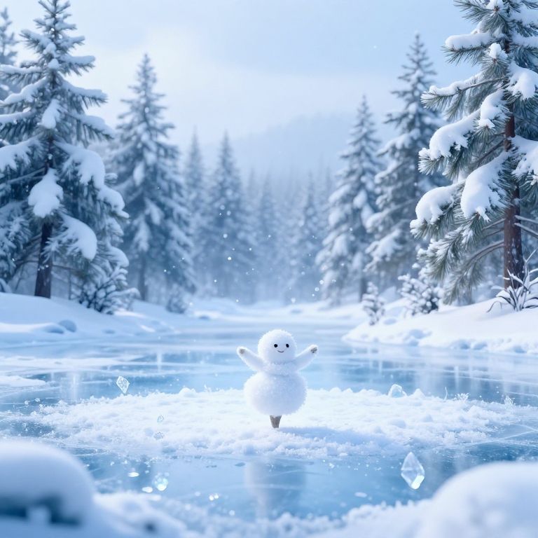 Sno depicted as a tiny snow spirit dancing atop a frozen lake surrounded by snow-covered pine trees, shimmering ice crystals in the air, ethereal blue and white hues, soft diffuse lighting, enchanting and peaceful winter scene, concept art style.
