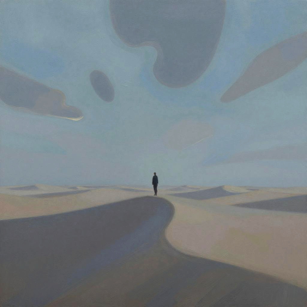 Estranheza depicted as a lone figure standing at the edge of a vast, shifting desert that blends into the sky, abstract forms floating around, cool blues and greys dominate, ethereal and introspective mood, painterly style with soft textures