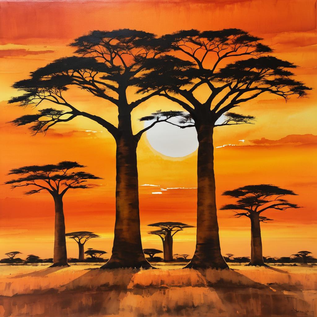 Baobab trees at sunset in Kenya, with vibrant orange and yellow hues painting the sky, emphasizing the beauty of the natural landscape.