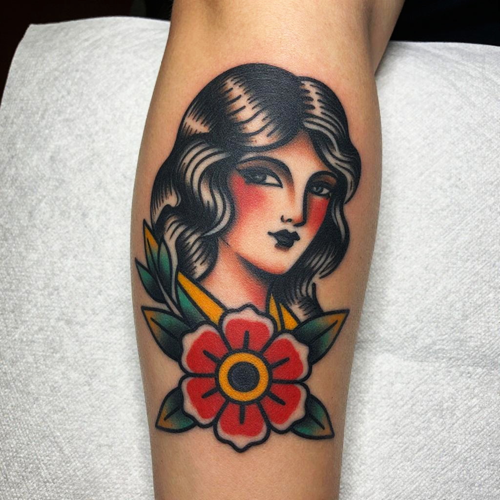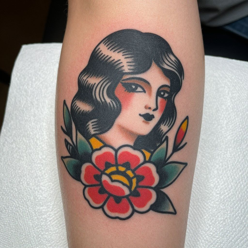 This is a close-up photo of a tattoo on a person's upper arm. The tattoo features a classic-style portrait of a woman with dark, wavy hair, surrounded by black leaves and a large red flower with yellow accents. Her expression is calm, with black lips and subtle blush. The tattoo has bold black outlines and a traditional tattoo style. The background is a white towel.