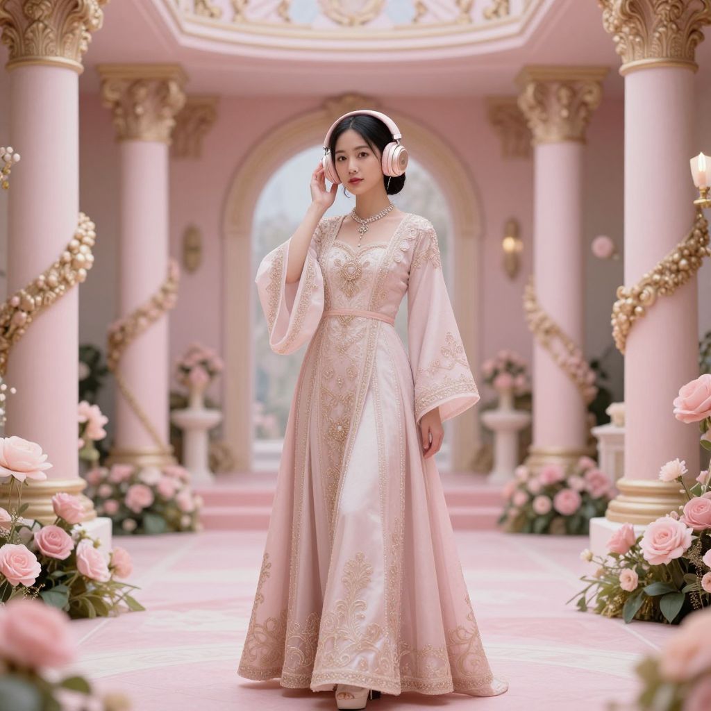 A woman in a traditional dress and headphones stands in a dreamy, surreal garden with pink flowers and columns, exuding luxury and elegance.