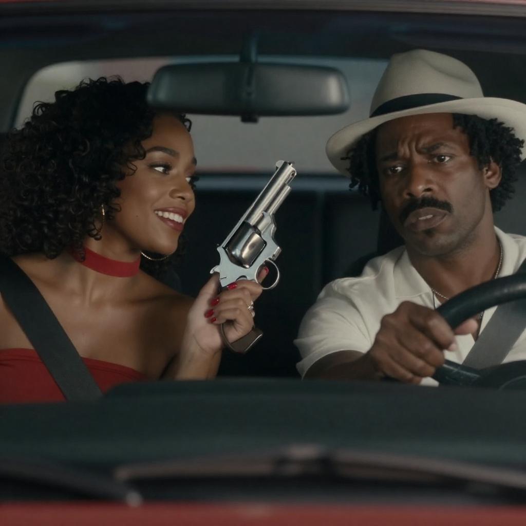 Portrait of a Black male singer with short curly hair, wearing a sparkly white jacket and brown vest, singing passionately with mouth wide open while pointing with his right hand. In the background, a smiling female singer with curly hair holds a microphone. The setting is a retro neon-lit bar featuring palm plants and the hood of a vintage car visible in the foreground.