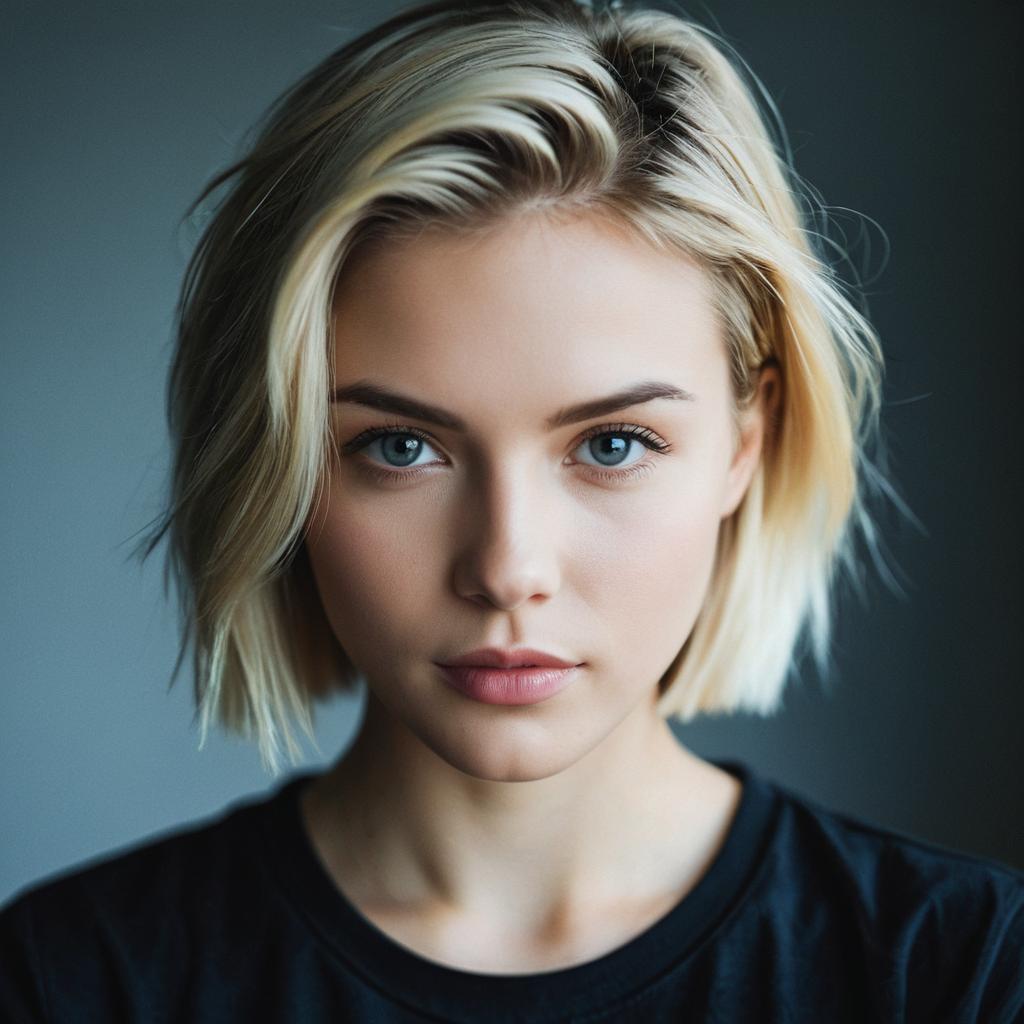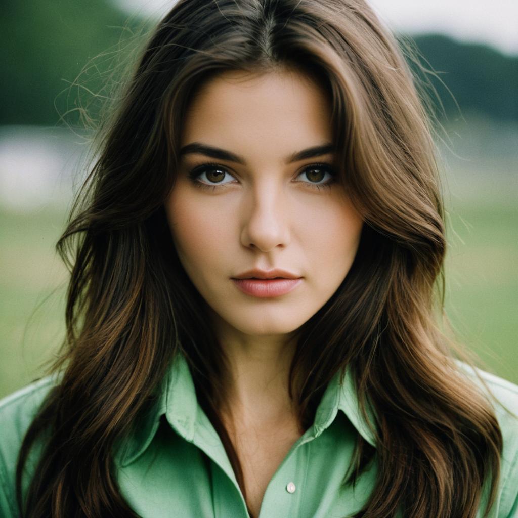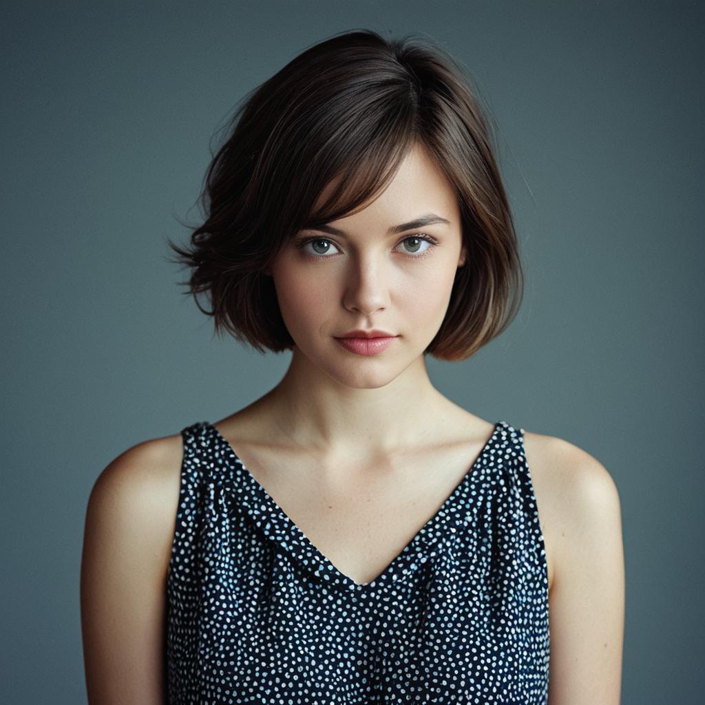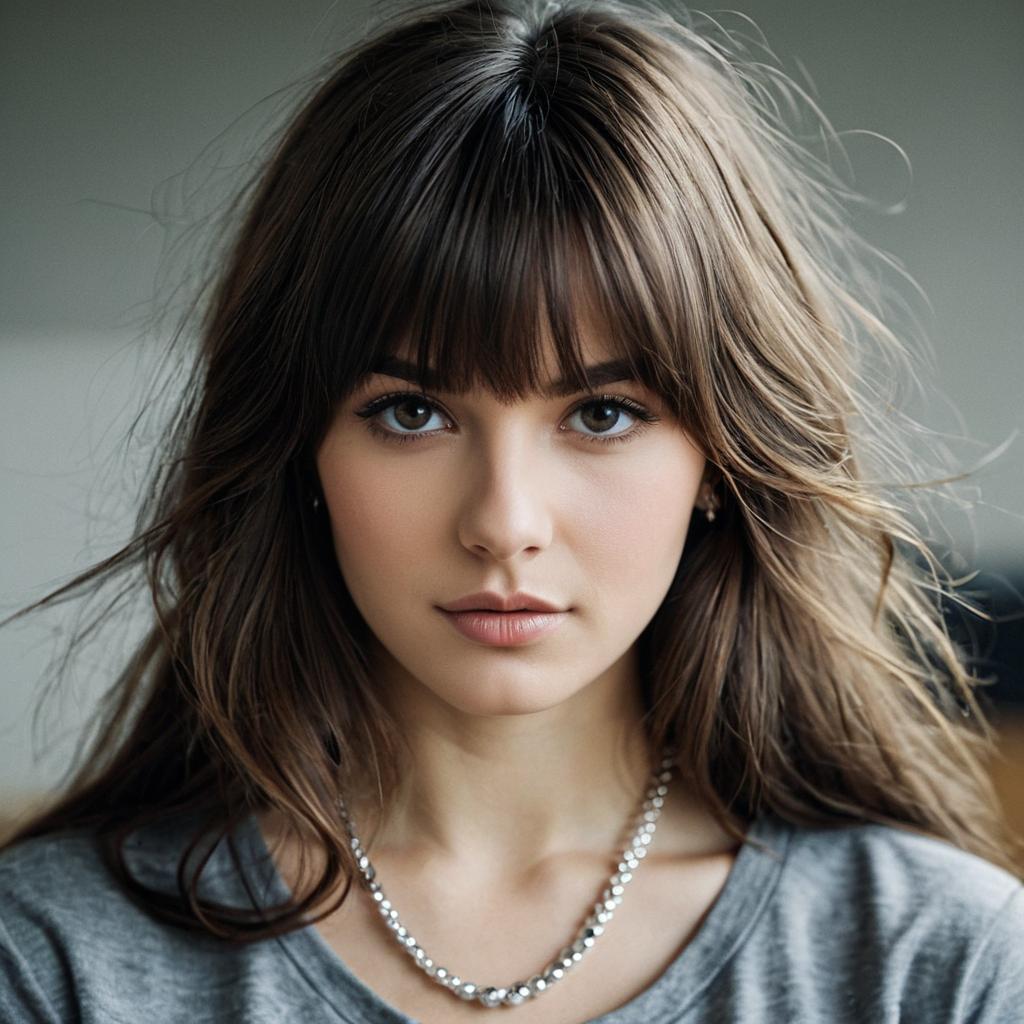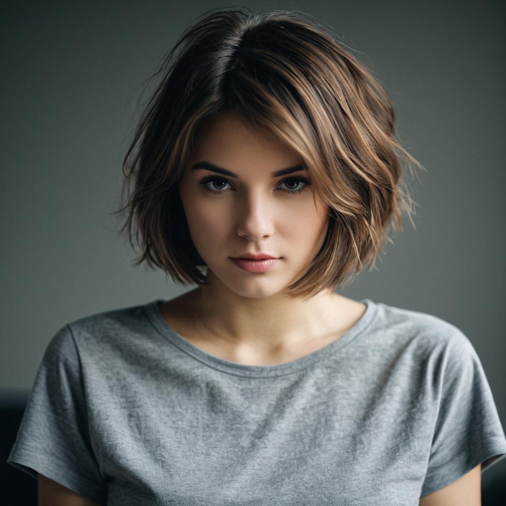 Shoulder length hair cut,1girl, solo, realistic, brown hair, shirt, looking at viewer, lips, red shirt, upper body, closed mouth, brown background, messy hair, long hair, photorealistic