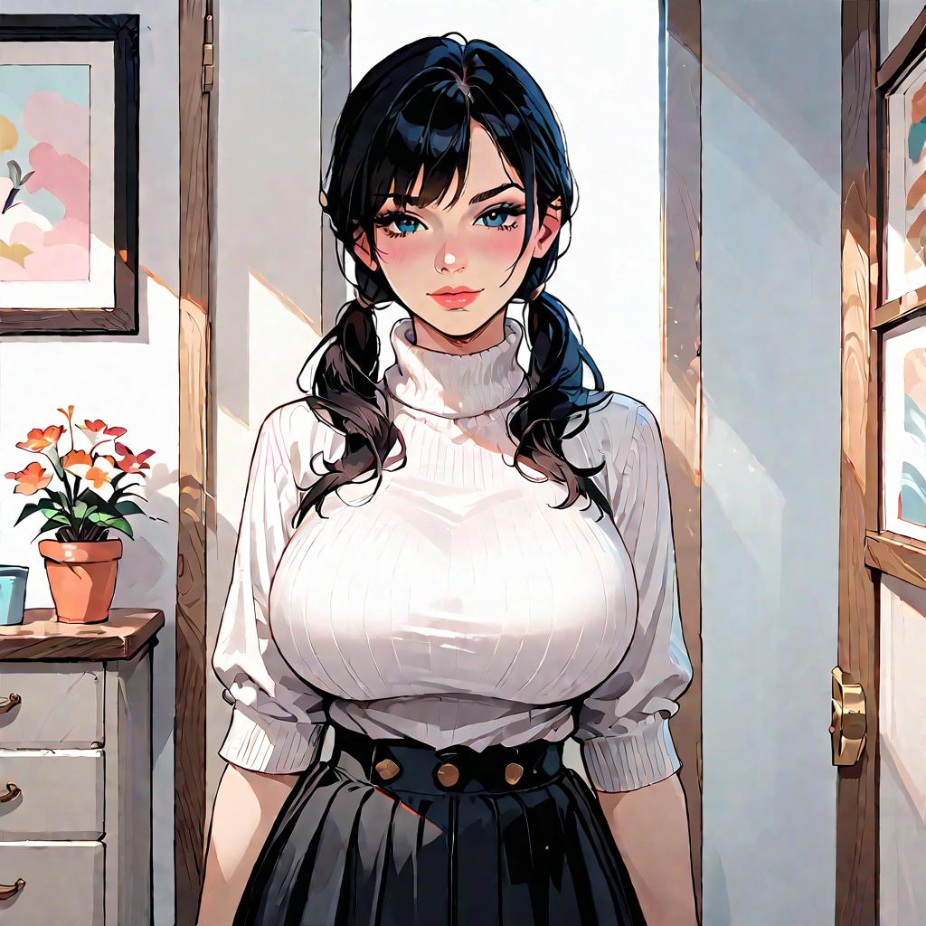 Score_9, score_8_up, score_7_up, source_anime, 1girl, blue eyes, twintails, black hair, turtleneck sweater, white sweater, black skirt, grin, looking at viewer, from front, bedroom, standing, huge breasts
