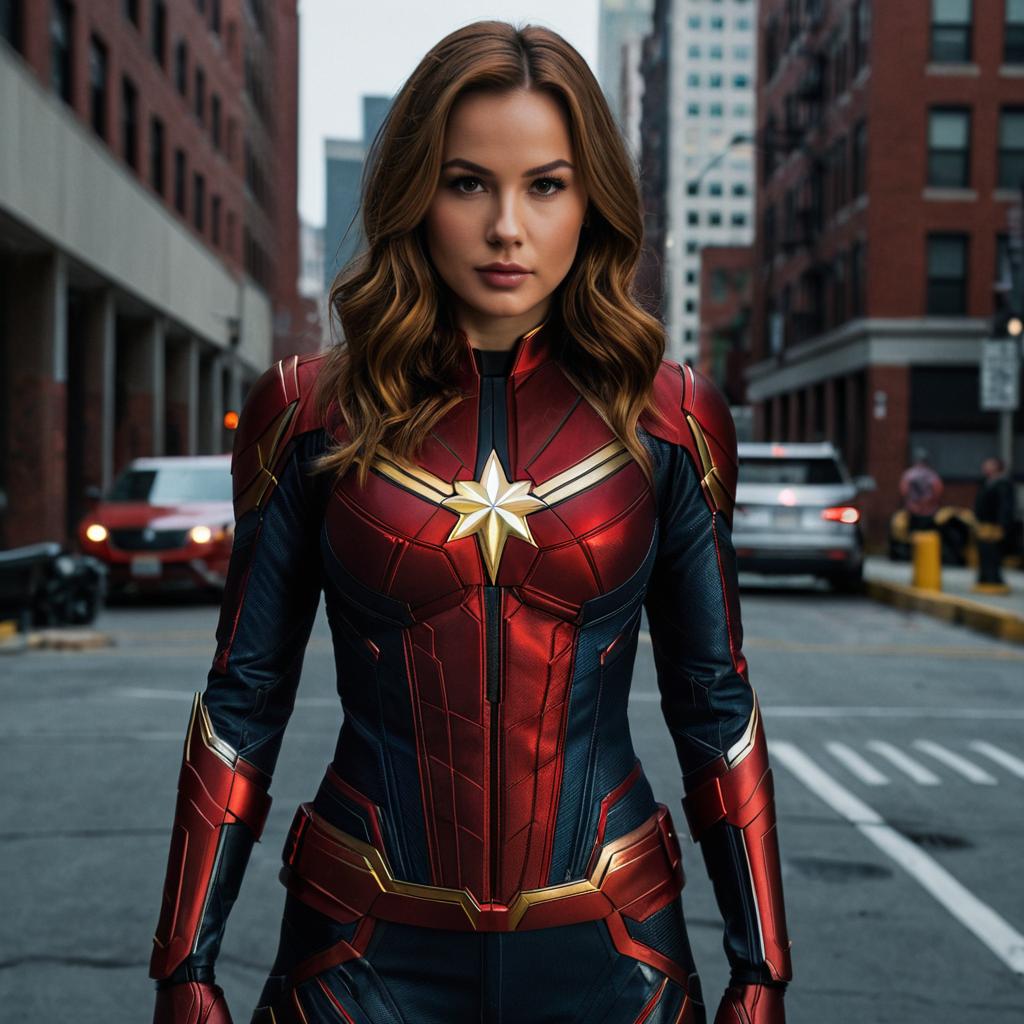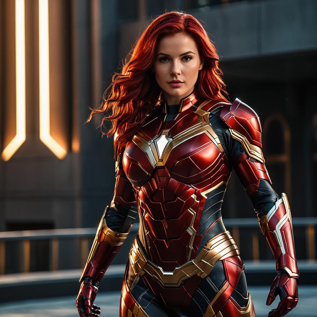 Red titan costume, photorealistic, red-haired woman, superhero armor, red and gold suit, detailed ures, high-quality CGI, front view, intense expression, wavy hair, realistic lighting, blurred architectural background, standing pose, armor highlights, shiny surface, dramatic lighting, character from Marvel, detailed shadows, full body shot