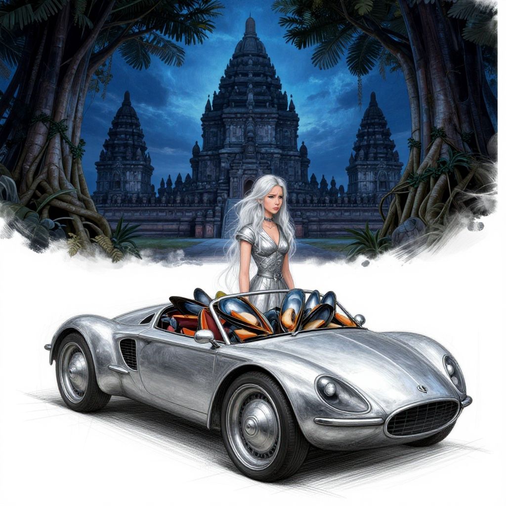 Digital artwork of a silver-haired woman in a silver bikini, seated in a sleek silver convertible, in front of ancient temple ruins at night. Dark trees