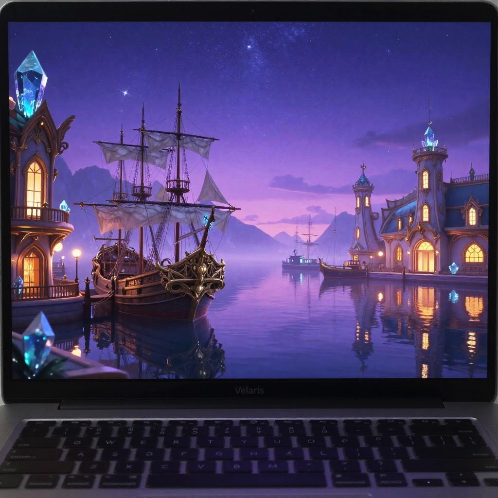 Velaris computer background depicting an enchanted harbor at dusk, with ornate ships docked next to graceful buildings adorned with glowing crystals, under a starry, violet-hued sky, capturing a tranquil, magical mood with fine fantasy detailing.