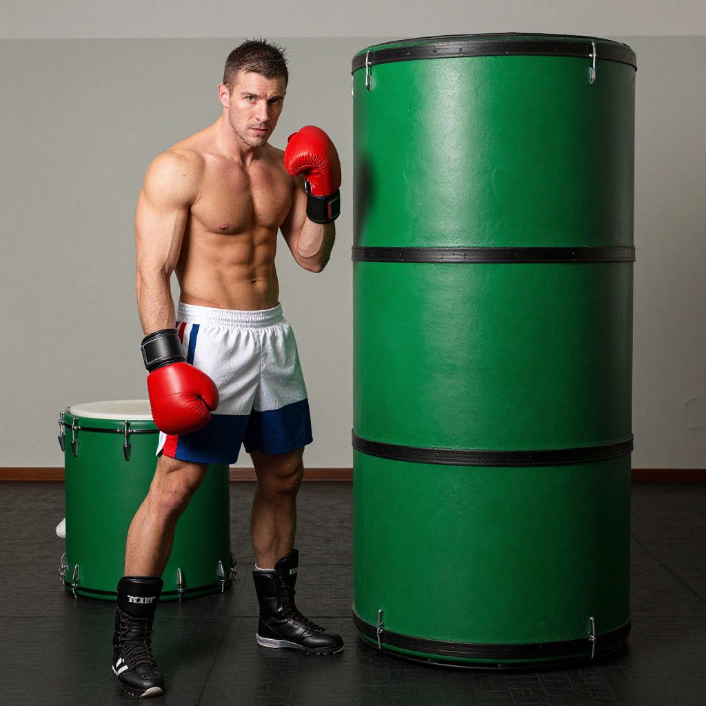 A muscular man wearing boxing gloves stands next to a large, green drum machine.