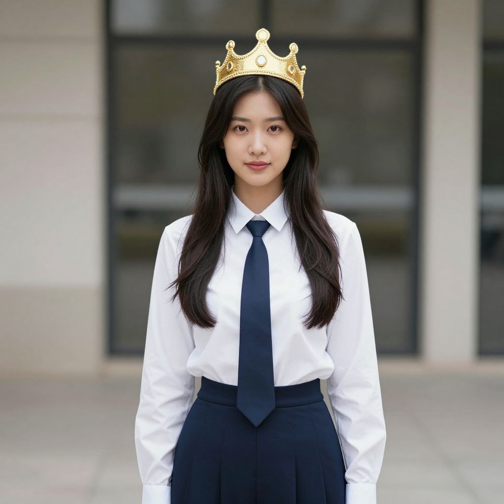 Photograph of an Asian woman with long black hair, wearing a white button-down shirt, black tie, and black skirt. She has a gold crown with small jewels on her head. She stands in front of a modern building with large glass windows. Her expression is neutral, and the background is slightly blurred. The image has a realistic style with sharp focus on the woman and soft focus on the background. The colors are predominantly white, black, and gold.