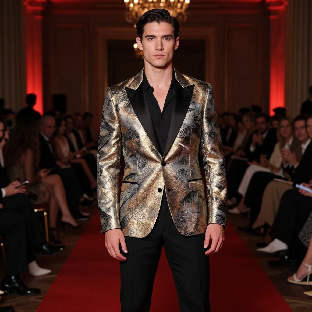 Statement jackets for men at a luxury fashion event, high-end metallic finish, abstract art patterns, sleek black trousers, standing in a dimly lit ballroom, elegant ambiance, red carpet glow, cinematic composition.
