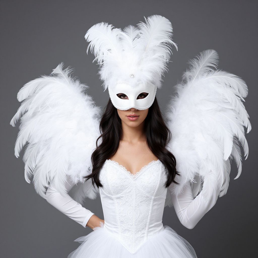 "White Carnival Costume, dressed in white with feathers and a white mask"