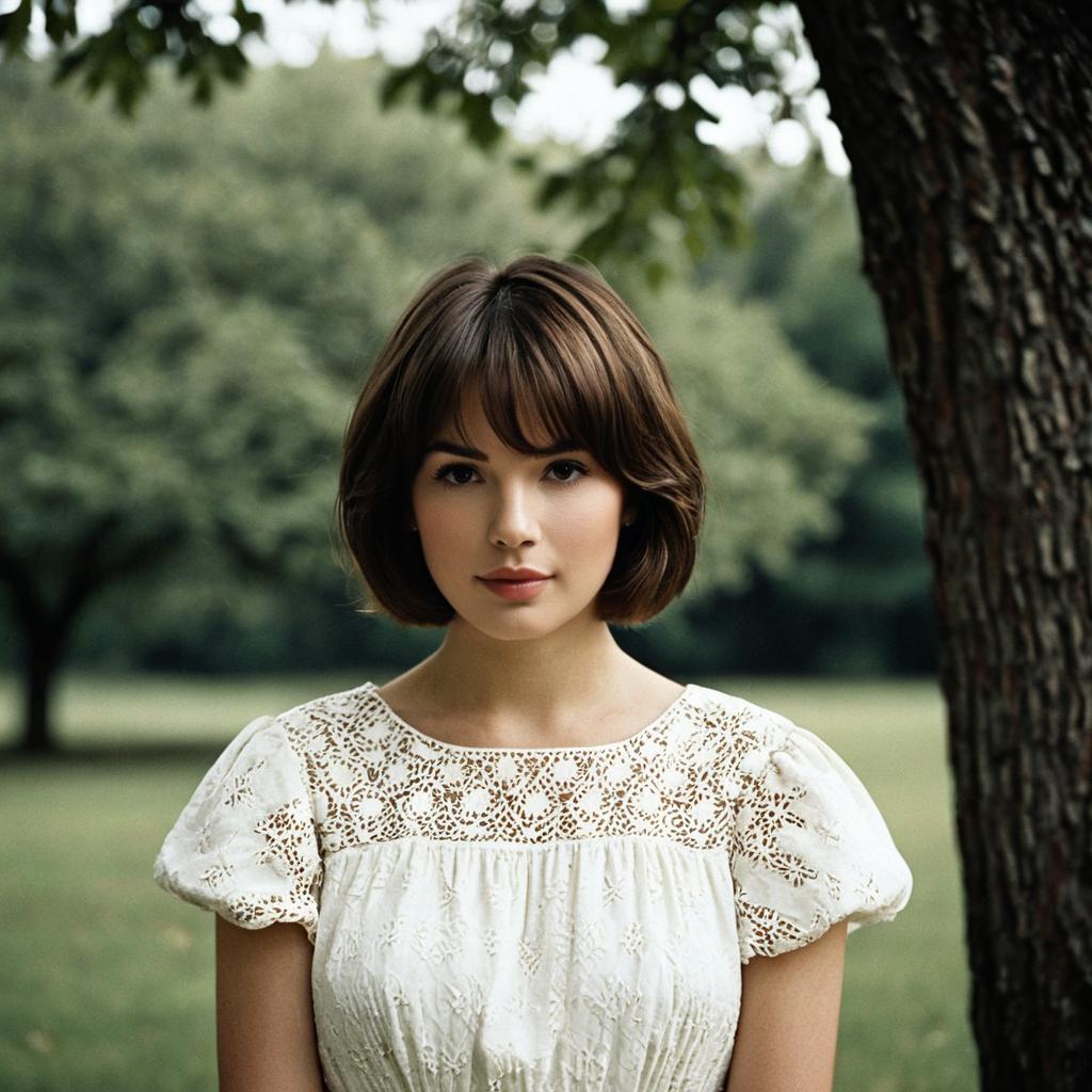 Portrait of a young woman with brown hair and brown eyes wearing a white floral print dress with red flowers and a matching flower in her hair. She is attending a tea party with two men in formal attire seated at a table with matching floral patterned wallpaper and tea set in the background.