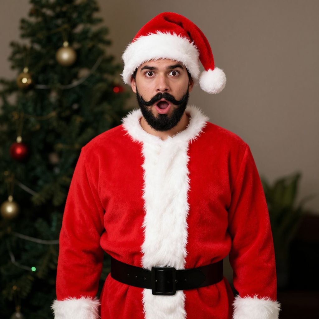 Outrageous christmas outfit, 1boy, male focus, hat, solo, santa hat, santa costume, christmas, facial hair, christmas tree, looking at viewer, mustache, belt, fur trim, black hair, realistic, long sleeves, coat