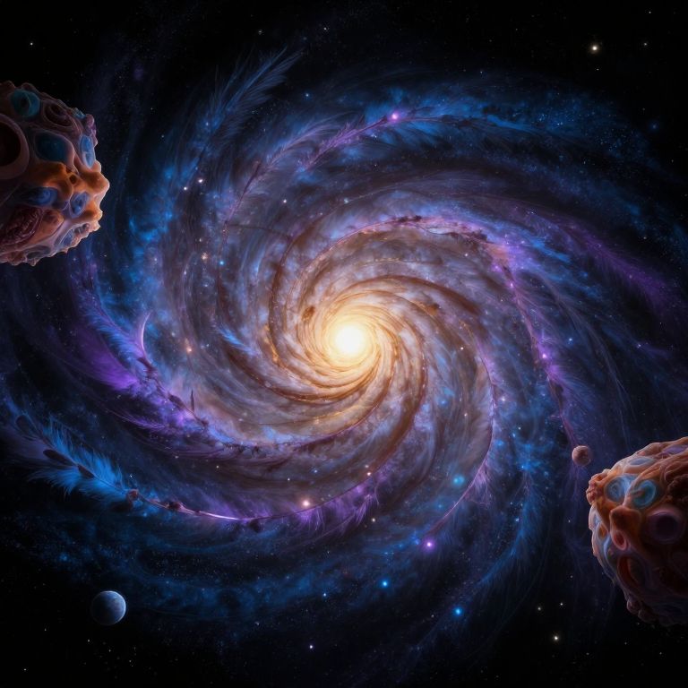 The image presents a mesmerizing, intricate 8K HD depiction of an infinite universe, where time and space flow in a trippy, iridescent manner. At the center, a radiant spiral galaxy emanates a warm, golden glow, surrounded by swirling patterns of blue and purple hues. This central spiral is encircled by a series of concentric rings, each adorned with delicate, feather-like textures and speckled with tiny, sparkling stars. The spiral galaxy is flanked by two large, organic structures, one on the left and one on the right, both exhibiting a rich tapestry of colors and textures. These structures appear to be in motion, creating a sense of depth and dynamism within the composition. The background is a vast expanse of dark, star-studded space, punctuated by numerous small, glowing planets and celestial bodies that add to the sense of infinite vastness. The overall arrangement of elements creates a harmonious balance, with the central spiral galaxy serving as the focal point, drawing the viewer's eye into the depths of the universe.