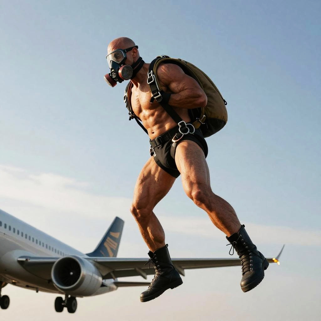 Photograph of muscular, bald man in black leather harness, gas mask, and boots, mid-jump above airplane against clear blue sky.