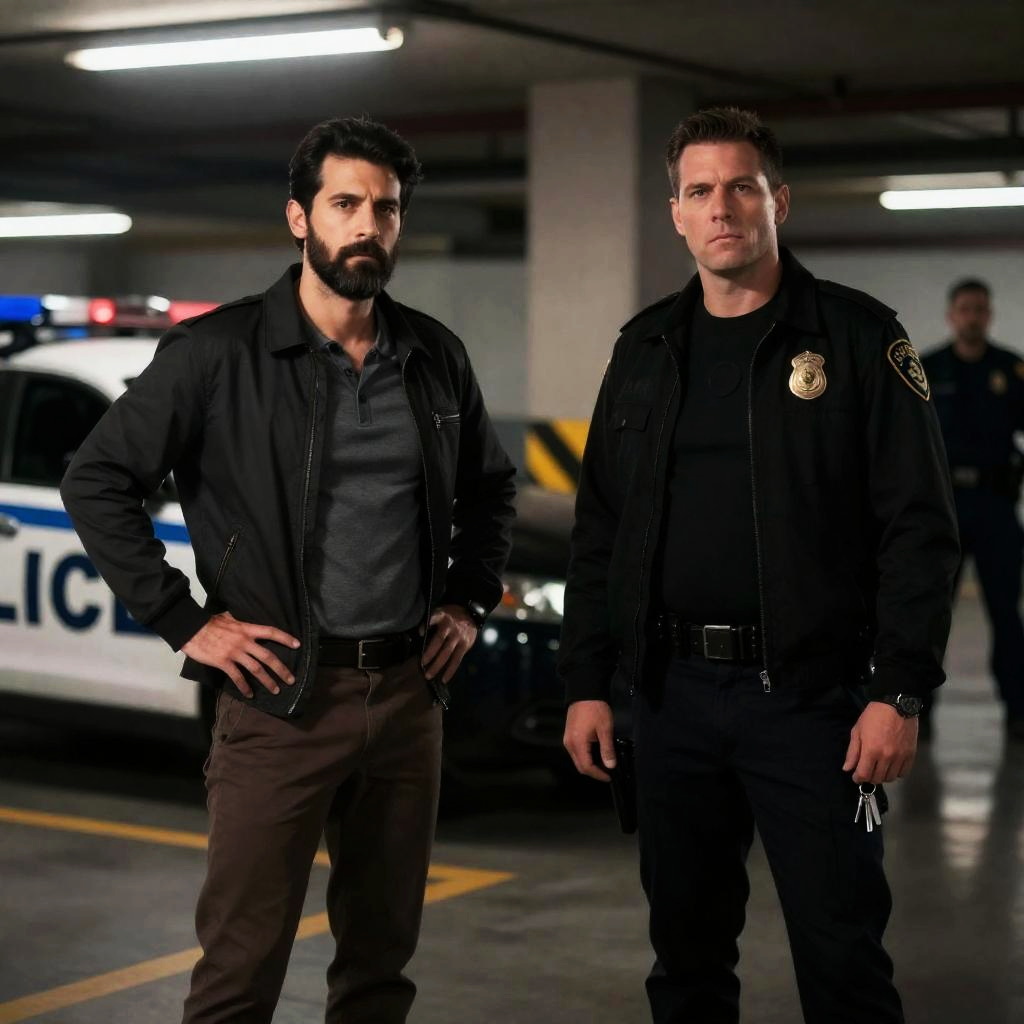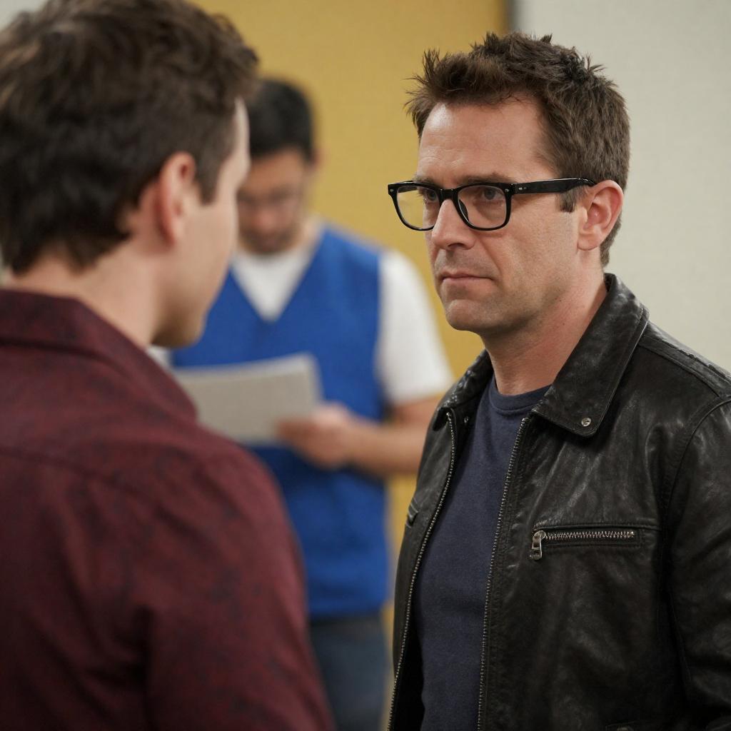 Three men at a metal table in a prison-like setting. Left: obese man in orange shirt, black cap, arms crossed, side profile. Center: muscular man with short brown hair, blue plaid shirt, neutral expression, hands on table. Right: muscular man with short dark hair, black t-shirt, intense expression, leaning forward, hands on table. Background: blue walls, white bars, blurred figures.