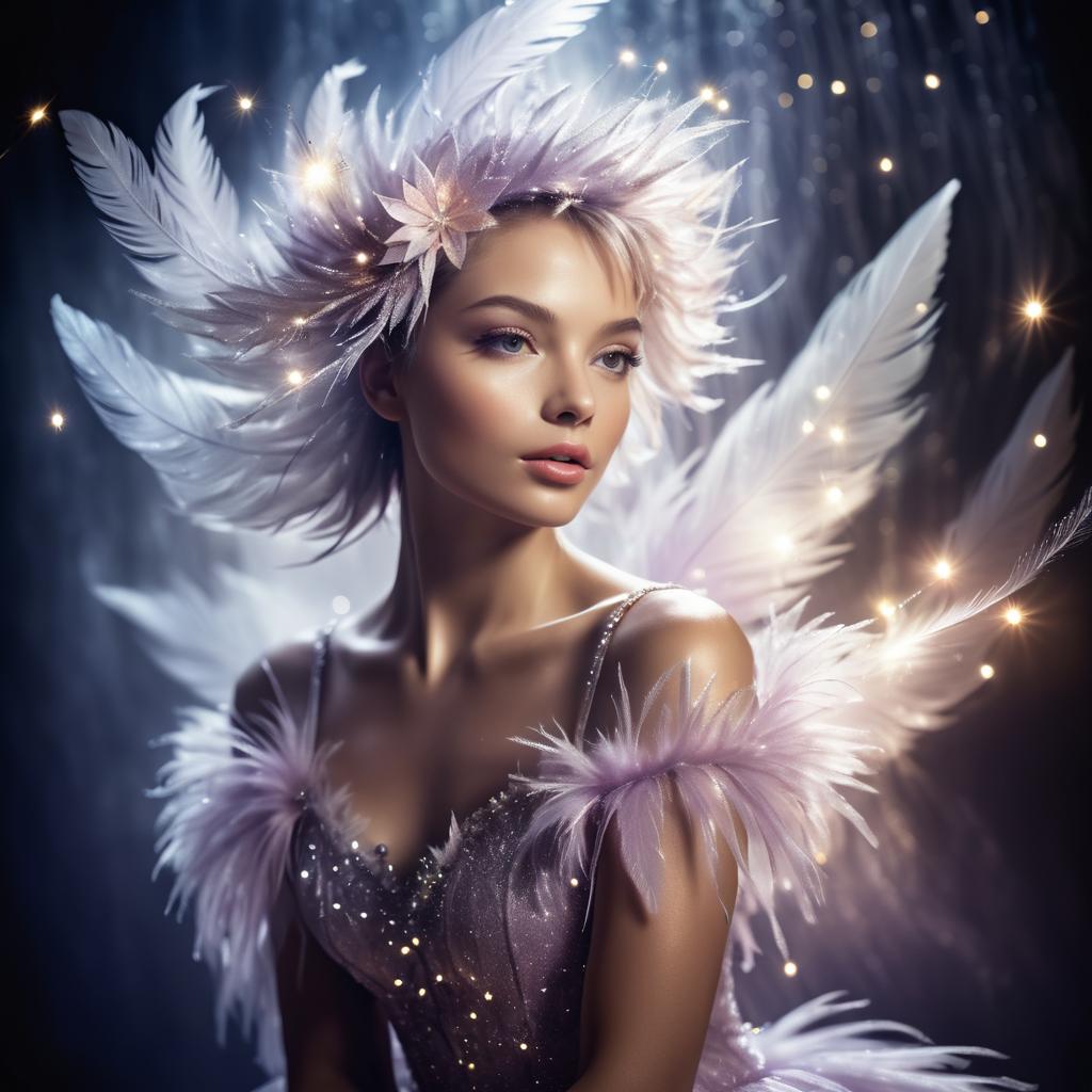 Portrait of a whimsical fairy made of soft feathers with sparkling dust trails, dramatic lighting.