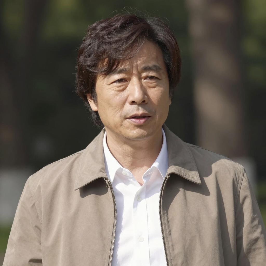 Portrait of an Asian man with long dark hair and a beard, smoking a brown tobacco pipe. The man has an intense, focused expression and is dressed in a dark jacket over a black shirt. The background features a blurred stone wall under dark, low contrast lighting, highlighting the contemplative mood.