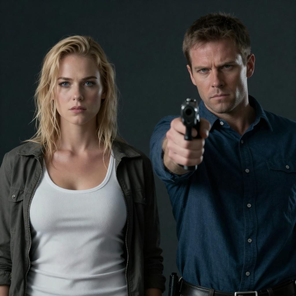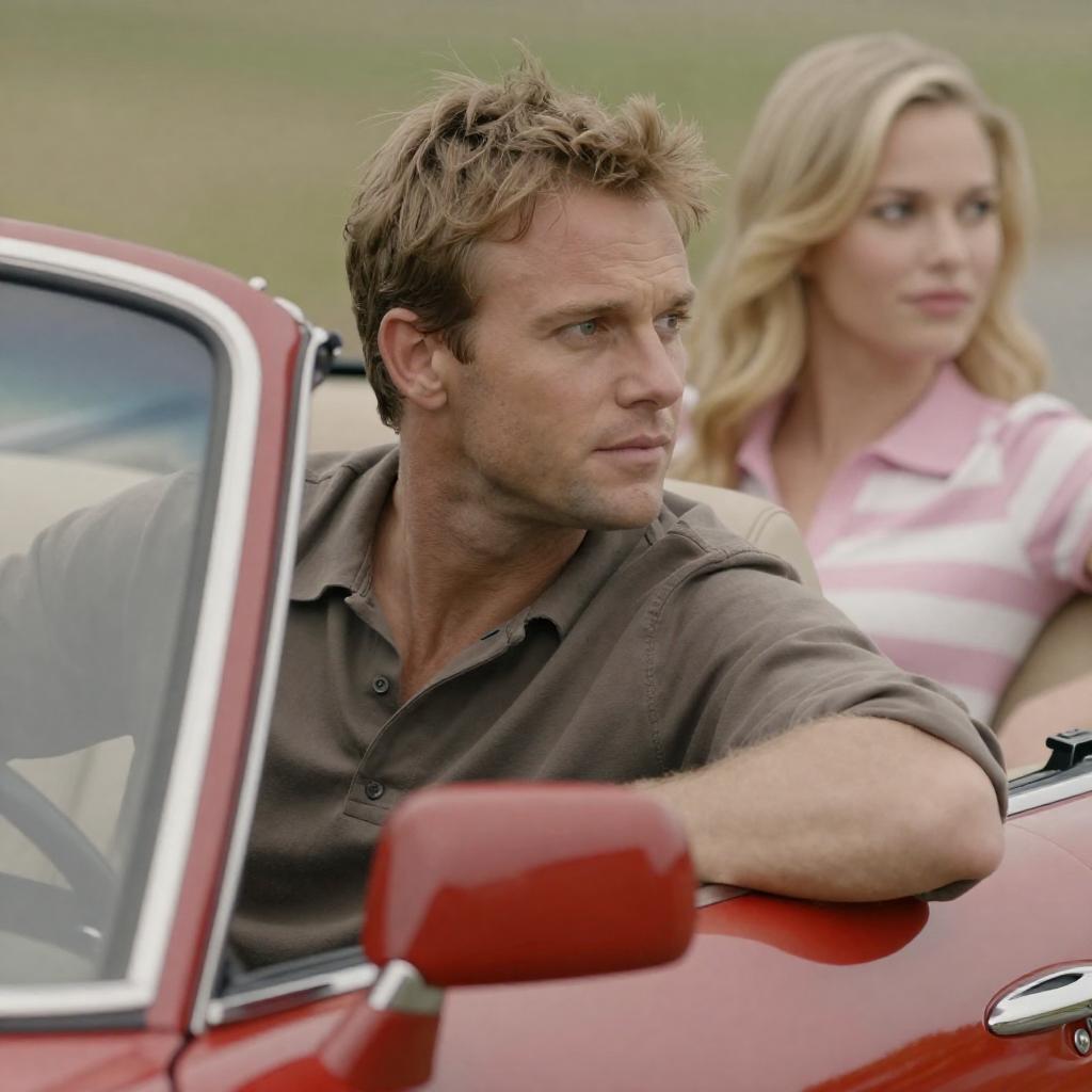 Photograph of a man with light brown hair and a brown shirt leaning out of a red convertible, looking to the right. A blonde woman with a pink and white striped shirt is in the background, slightly out of focus. Both have neutral expressions. The car's window is down, and the interior is beige.