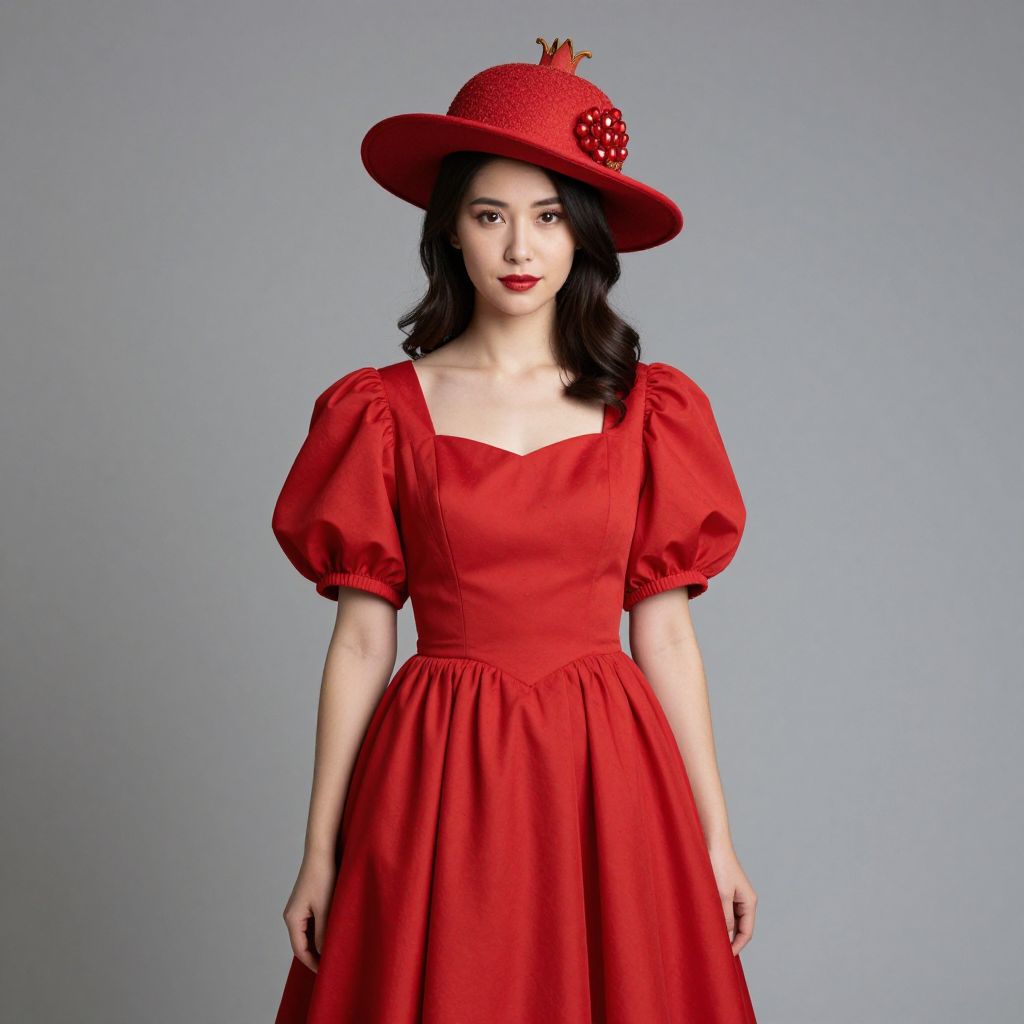 Photograph of an East Asian woman with fair skin and black wavy hair, wearing a vibrant red, puffed-sleeve dress with a square neckline and a full skirt. She also dons a red wide-brimmed hat adorned with a small red flower and pearl-like ornaments. Her makeup is subtle with red lipstick matching her outfit. The background is a plain, light gray, which contrasts with her bright attire. She stands confidently, facing the camera with a slight smile. The image has a soft, studio-lighting effect, emphasizing her elegant, vintage-inspired look.