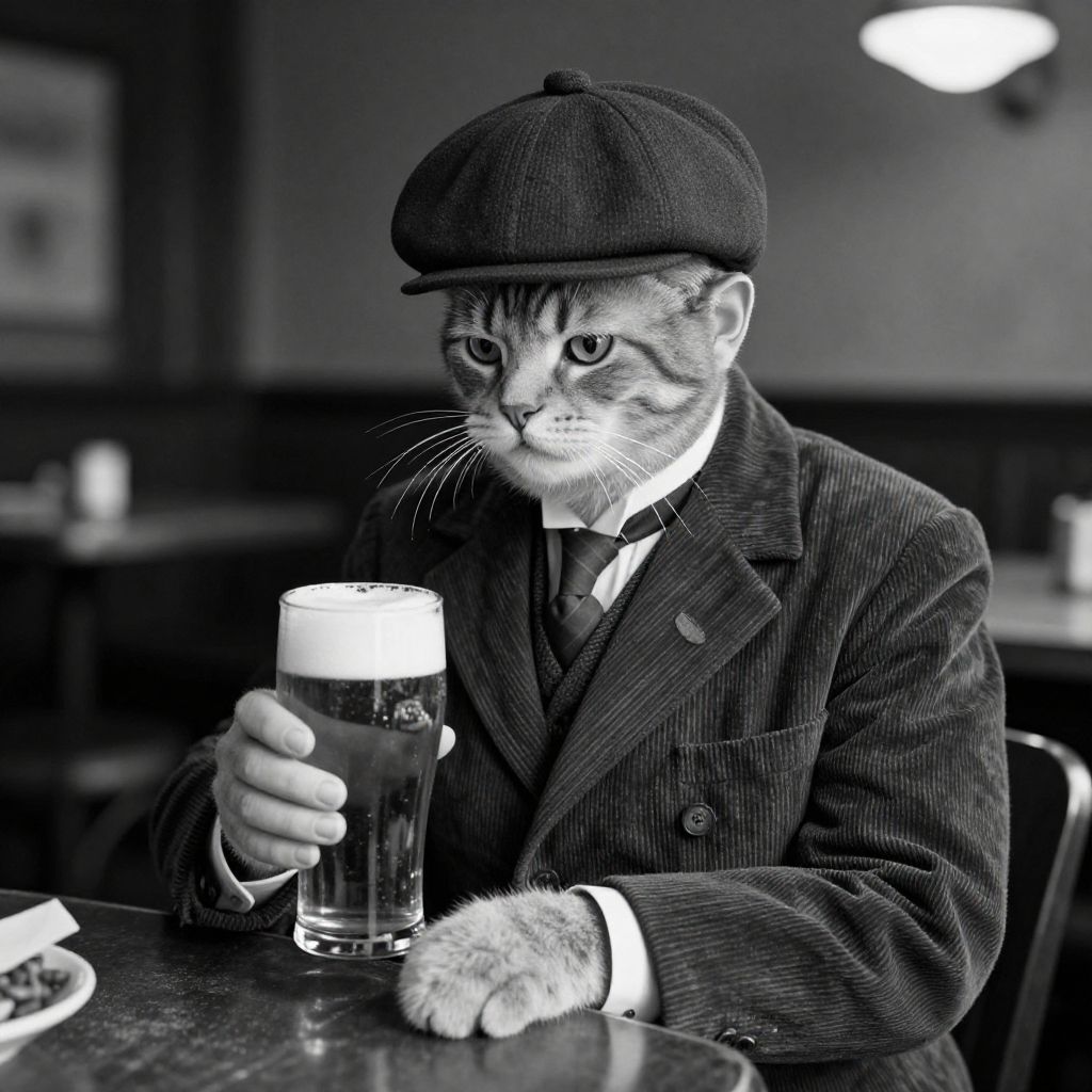 Distinguished Cat in 1930s Pub Holding Beer