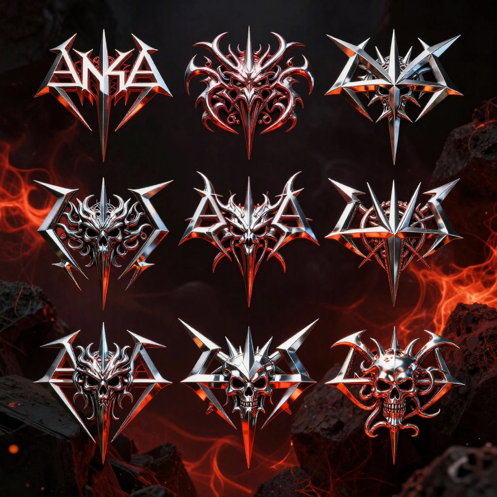 80s metal band logos, metallic chrome finish with razor-sharp points, fiery red and black palette, intricate emblem designs featuring mythic creatures and skull motifs, dynamic dramatic lighting