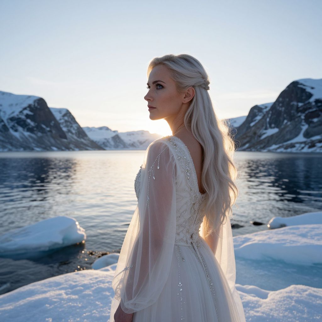 Envision a photorealistic portrait of a European woman in her late 30s, captured from a unique perspective directly behind her as she stands at the edge of an icy fjord during twilight. With striking sapphire eyes and long, platinum blonde hair, she gazes contemplatively over the shimmering waters. This portrait is crafted with a mirrorless camera, masterfully blending high-key lighting with subtle chiaroscuro effects. Dramatic shadows play across her elegant features while a warm, ethereal glow illuminates her flowing gown, adorned with intricate embroidery and delicate crystals. The composition evokes a sense of serenity and introspection, reflecting the stark beauty of the Arctic landscape and showcasing the timeless grace of its subject. The viewer is invited to embark on a journey of discovery within this captivating frozen scenery, captured in a moment of tranquil contemplation.